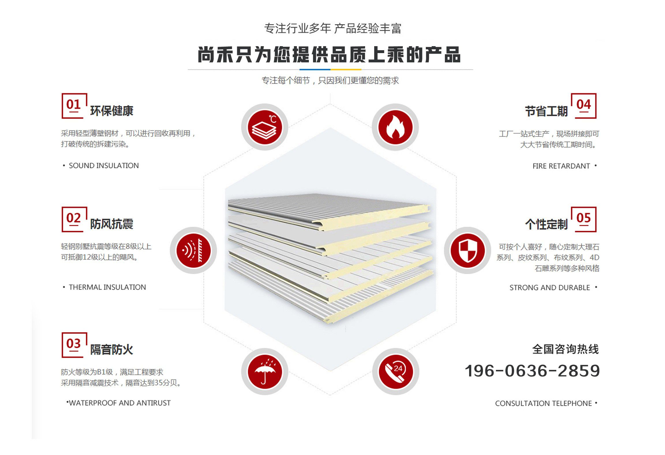 山東尚禾經貿有限公司是集板材設計、研發、生產、施工、一體化的科技公司,并在同行業中率先通過了質量、環境、安全管理體系認證。公司2011年投入資金2000余萬元引進世界先進的聚氨酯節能板連續生產線、意大利進口發泡系統,采用六組份在線自動操作混合澆注技術,在線一次性完成社會配料中心或工廠的配比混合工藝,并可以根據溫度在線自動調整,從而生產處與眾不同的高強度、節能型、綠色環保的聚氨酯夾芯板。(其使用年限高于同行業其他品牌5-10年) 公司主要經營范圍包括聚氨酯夾芯板,PU夾芯板,冷庫板,潔凈板,聚氨酯冷庫板,冷庫保溫板的設計、生產、銷售、技術指導、安裝及一體、以及進出口業務,是中部六省最大的綠色節能建材生產基地。聚氨酯夾芯板年產200萬平方米、PU夾芯板、冷庫保溫板500萬平方米、鏈整產業綜合實力,開創了六省至中西部創新型中小名企總部基地,并將著力推進中國中西部地區集成房屋住宅產業化發展進程?! 】萍紕撔?、節能典范。千萬間始終秉承“誠信、合作”的企業文化精髓,長期致力于鋼板材結構節能建筑產業,愿與社會各界攜手合作,共鑄綠色、環保美好未來。 產品具有良好的絕熱、阻燃、隔音、環保、耐久性能,可廣泛應用于工業、商用建筑內外墻、以及民用建筑外墻保溫、空調通風系統、專用防火保溫門等領域?! ∥覀兪冀K秉承...